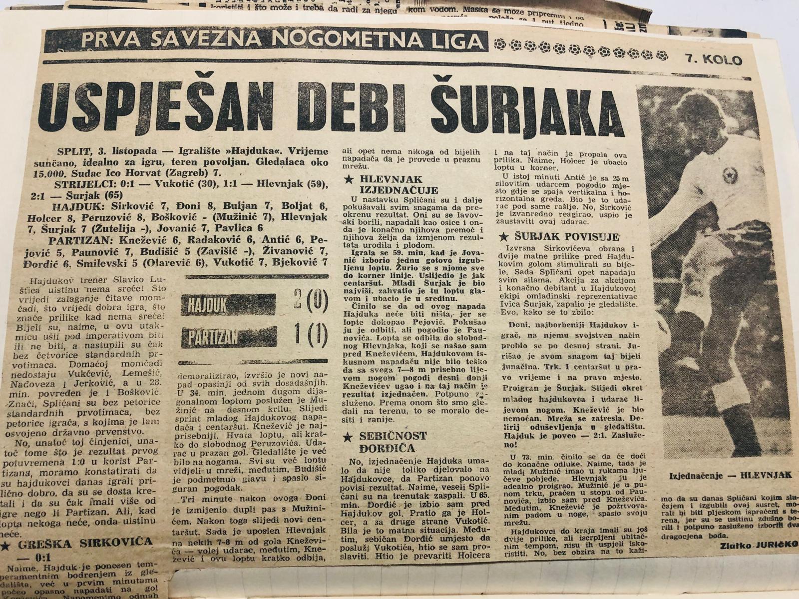 Šurjaku je debi ostao u pamćenju i po činjenici što je zabio i pogodak za pobjedu Splićana nad beogradskim suparnikom 2:1. O tom za svoju karijeru bitnom događaju sačuvao je i pisani trag, izvještaj iz Slobodne Dalmacije, ali, što je još važnije, i dres. Bijela boja s godinama je dobila i žute tragove, crvena zvijezda u grbu također je izblijedjela, no evo zašto dres ima povijesnu težinu.