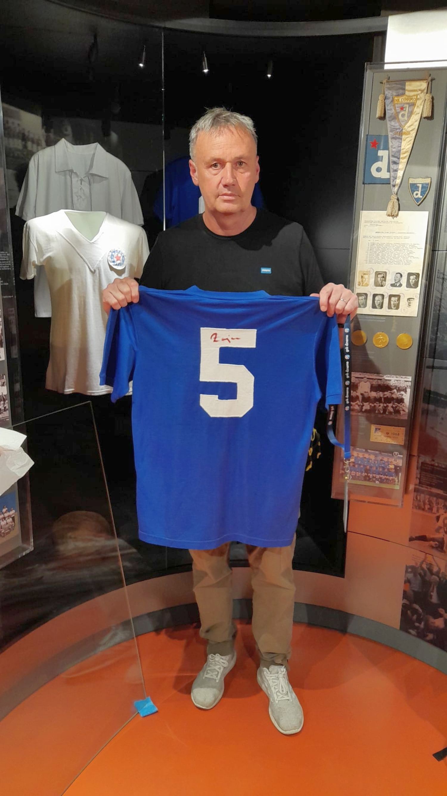 Njegov dres bit će uz bok onom suparnika iz plavog tabora. Riječ je o dresu Dinama s brojem 5 iz sezone 1981./82, one šampionske kad su zagrebački plavi dečki pod vodstvom trenera s bijelim šalom postali prvaci države nakon 24 sušne godine. Nosio ga je tadašnji kapetan Velimir Zajec.